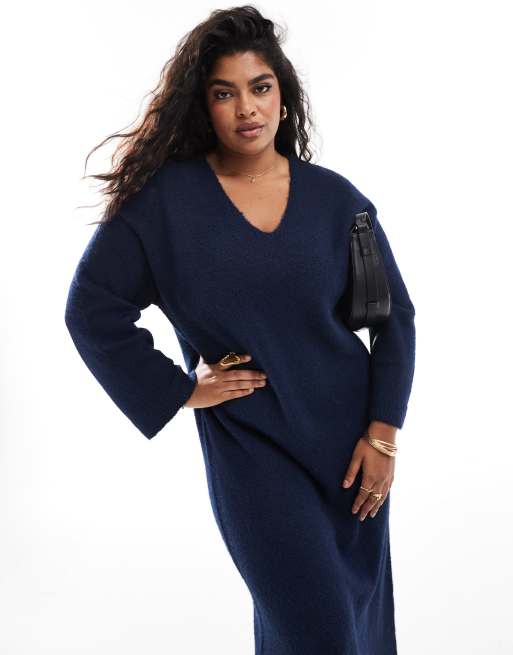 4th Reckless Plus wool mix fluffy knit v neck maxi jumper dress in navy ASOS Very well made.